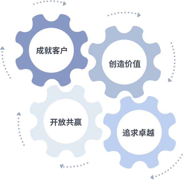 成就客户是一切决策的出发点,,,创造价值是衡量所有工作的标准,,,,追求卓越是我们做事做人的态度,,,,开放共赢是我们的格局也是最终的结果。。价值观的齿轮环环相扣,,,,推动着组织里的每个人不断向前。。